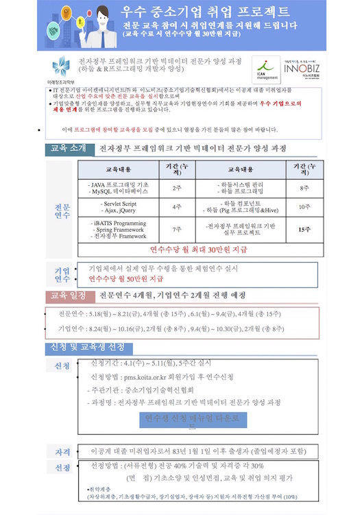[공고] 이공계 전문기술연수사업[무료과정] - 월30만원 지원