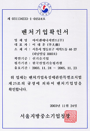 2003년 11월 24일 부로 한국산업기술평가원 평가하에 벤처 기업으로 등록이 되었습니다.